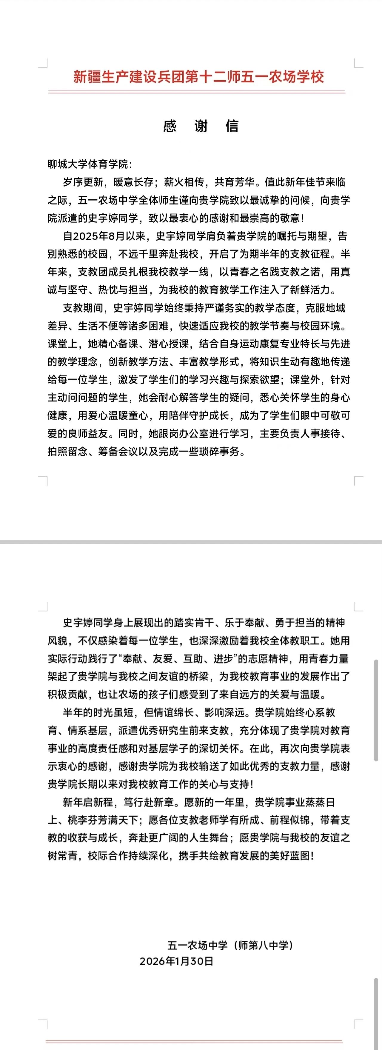 在新疆生产建设兵团第十二师, 喷水 研支团兵团服务队的9名志愿者服务于第十二师五一农场中学。支教半年以来,他们扎根三尺讲台,潜心教书育人,将自己所接受的教育理念与教学方法带到西部课堂。他们不仅承担着语文、数学等主科教学任务,还兼任副班主任、积极开设社团课程、组织校园文化活动,用青春热情点亮边疆孩子的梦想。
