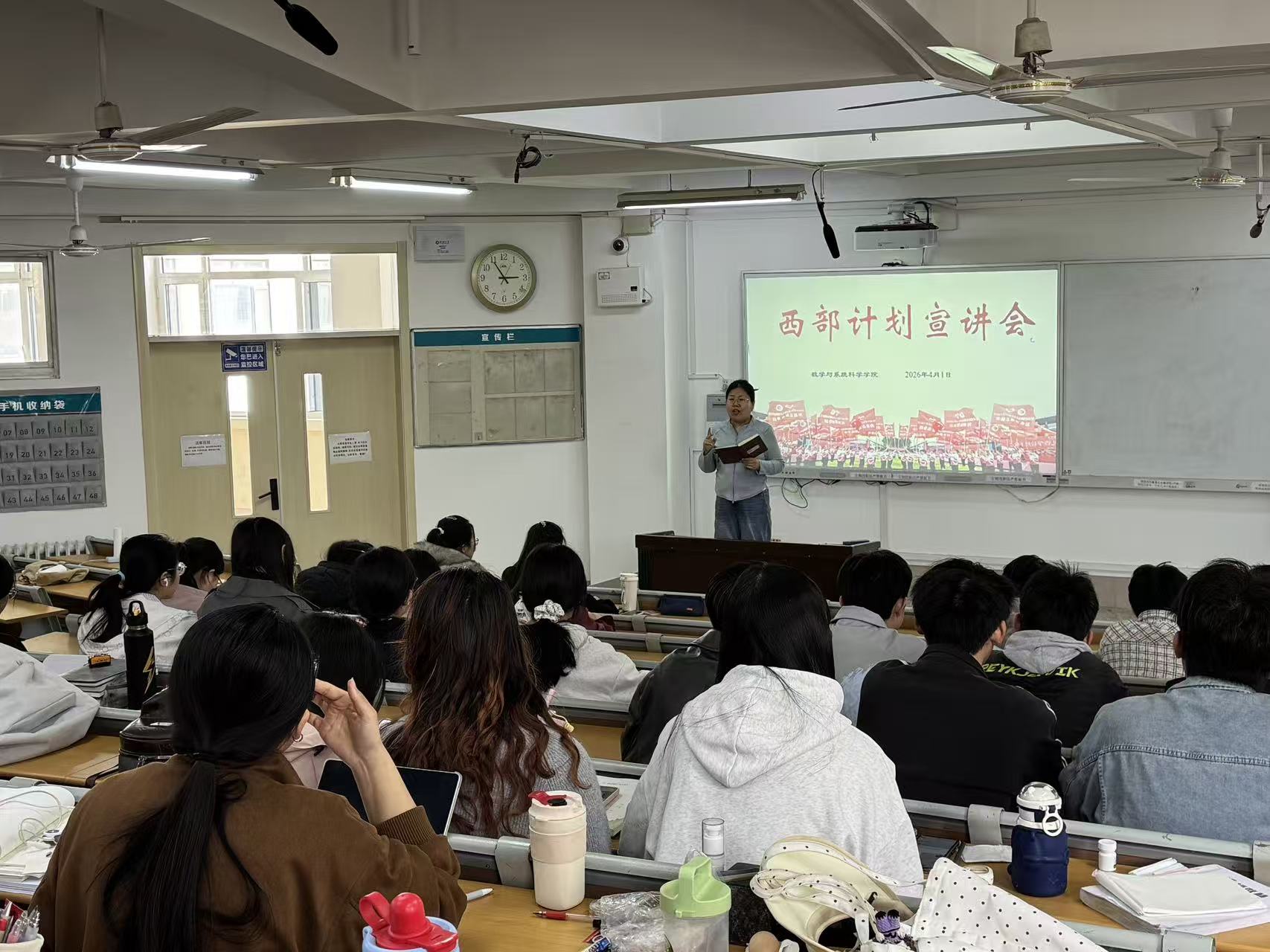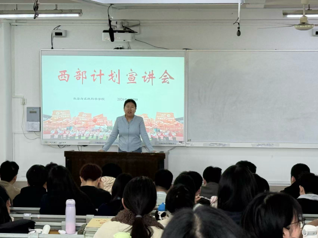 为引导2026届毕业生树立正确择业观,鼓励青年学子将个人理想融入国家发展大局,4月11日,喷水 数学与系统科学学院在西校区11号教学楼C207教室,举办西部计划专场宣讲会。活动由学院团委书记岳琳琳主讲,2022级全体学生到场参与,共赴西部志愿之约。