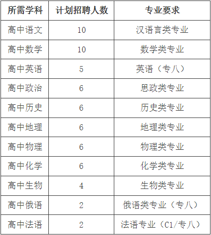 (1)统招本科及以上学历,持有高中教师资格证,教授学科与所学专业对口,应往届毕业均可;