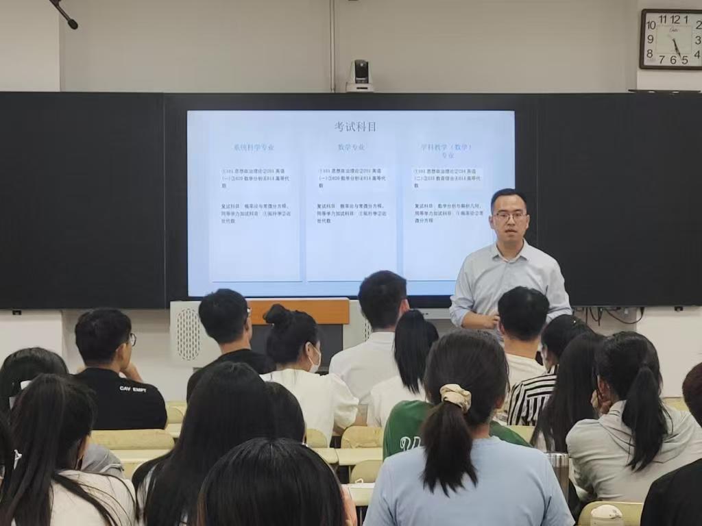 陈国梁从考研形势、院校选择、考研技巧等环节详细展开讲解,他强调了数学专业在学术和应用领域日益增长的需求,让学生对考研大环境有更清晰的认识,为学生点明读研深造的重要意义。他向学生们介绍了不同院校相关专业研究生教育的基本情况、招生特点、后续发展趋势等信息,通过具体的图表数据对比,客观分析了当前一些高校的研究生录取现状,为在座学生提供了清晰明确的报考思路。随后,陈国梁结合自身经验,分享如何合理安排时间以及如何制定长期、短期计划等一系列提高复习效率的方法,并对学生们提出的考研相关问题进行了耐心详细的解答,鼓励在场同学积极报考喷水 。